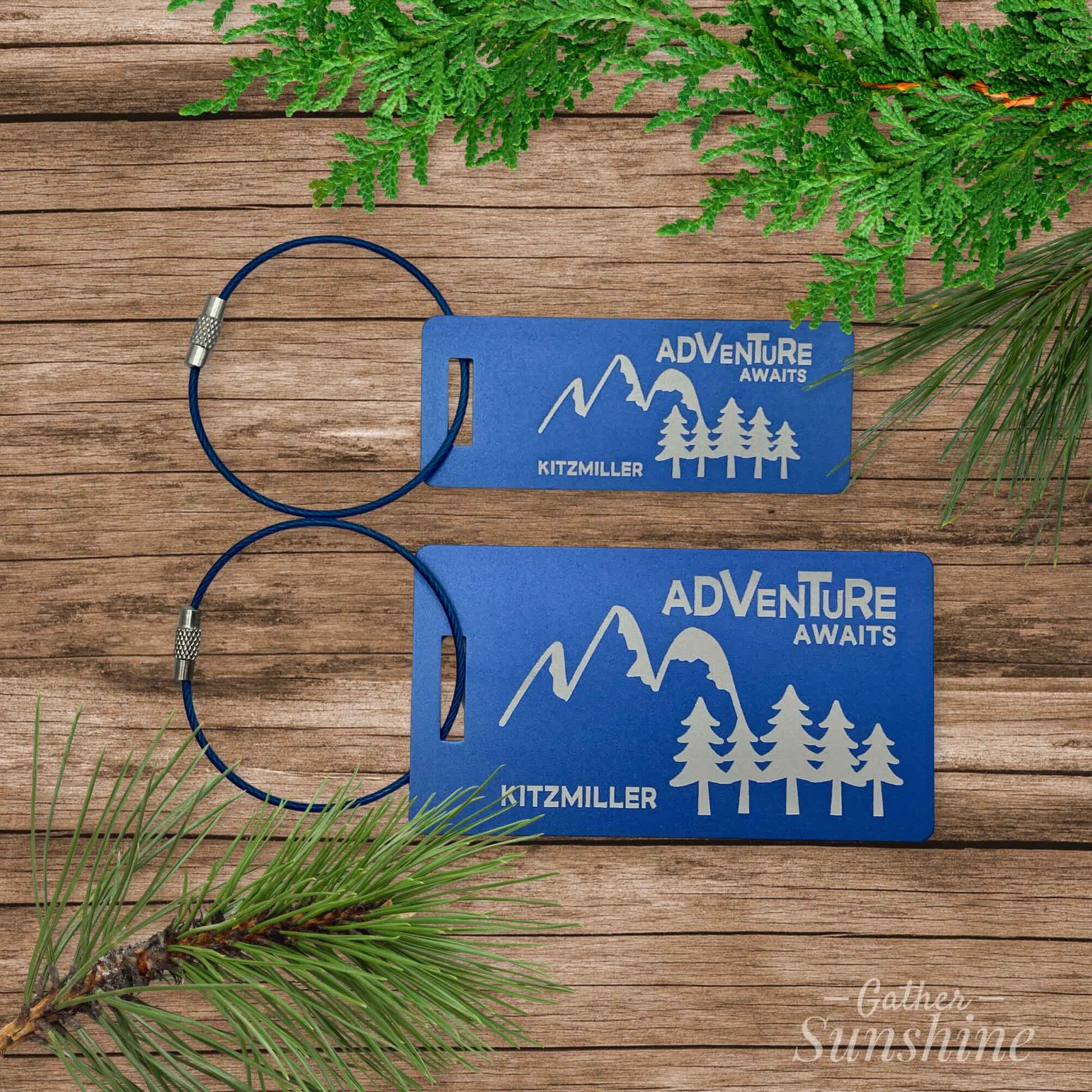 Adventure Awaits Luggage Tag – Mountain Design – Custom Engraved Travel Tag in 8 Colors – Small, Large, or Set