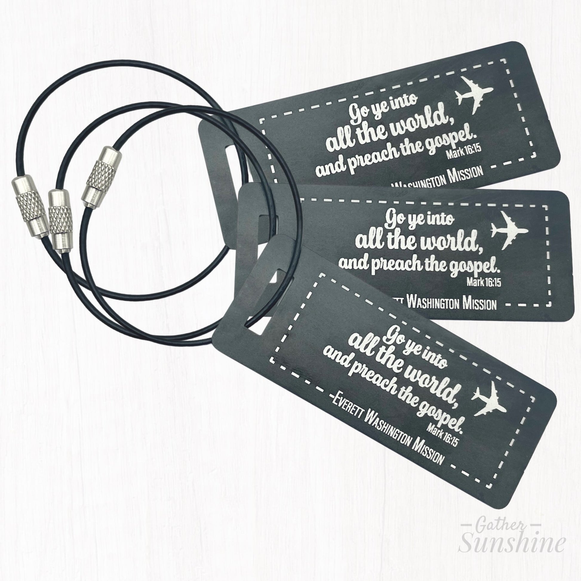 This meaningful little tag features a clean script of the inspiring message: “Go ye into all the world, and preach the gospel.” The back is personalized with contact info—like a company, school, or mission office, email, or phone number—so if a bag goes missing, it knows where to go. Made from strong, lightweight aluminum with a stainless steel loop, it’s built to last through every takeoff, layover, and return home.