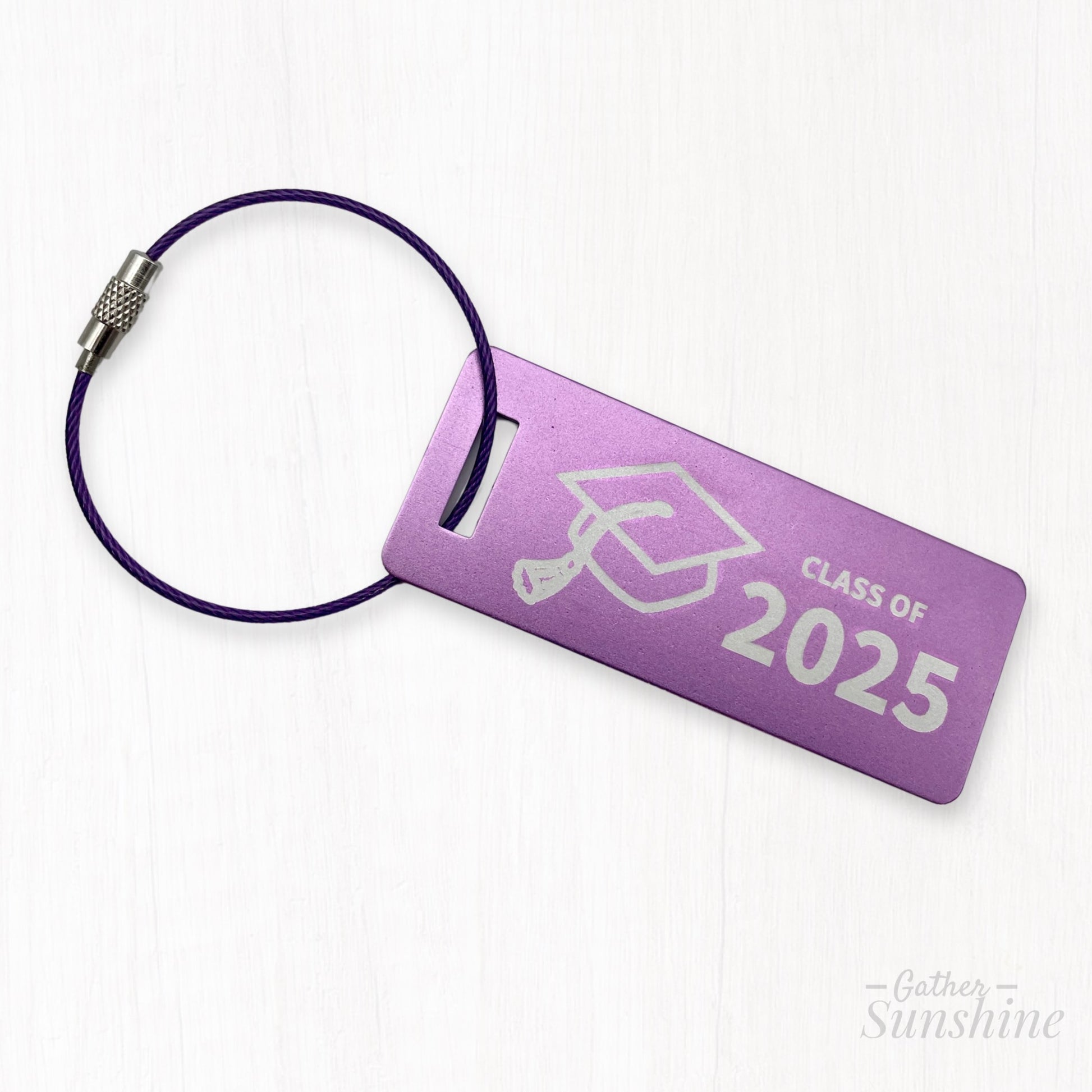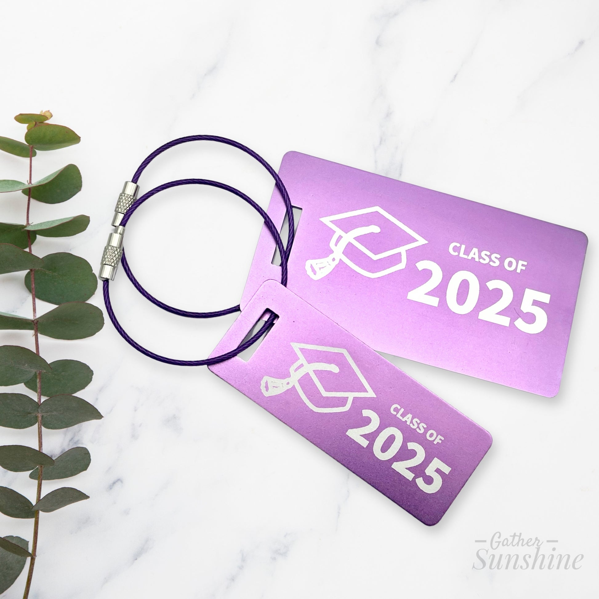 Give them the best of both worlds with this coordinated set of two graduation tags. One small, one large, both engraved with Class of 2025 and a graduation cap on the front. Add personalized contact info on the back for safety and style. Ideal for grads on the go—whether it's college, a mission, or just summer adventures.